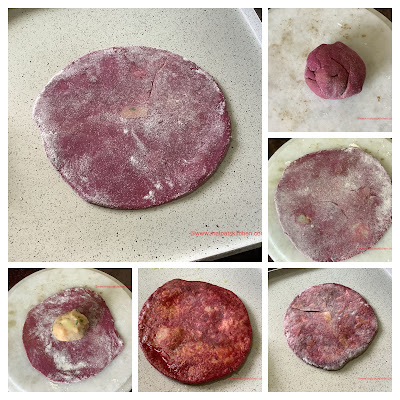 A beet ball taken, flattened slightly, aloo filling kept, closed, then flattened again, dry roasted on tawa on both sides, then little bit ghee sprinkled, and cooked well.